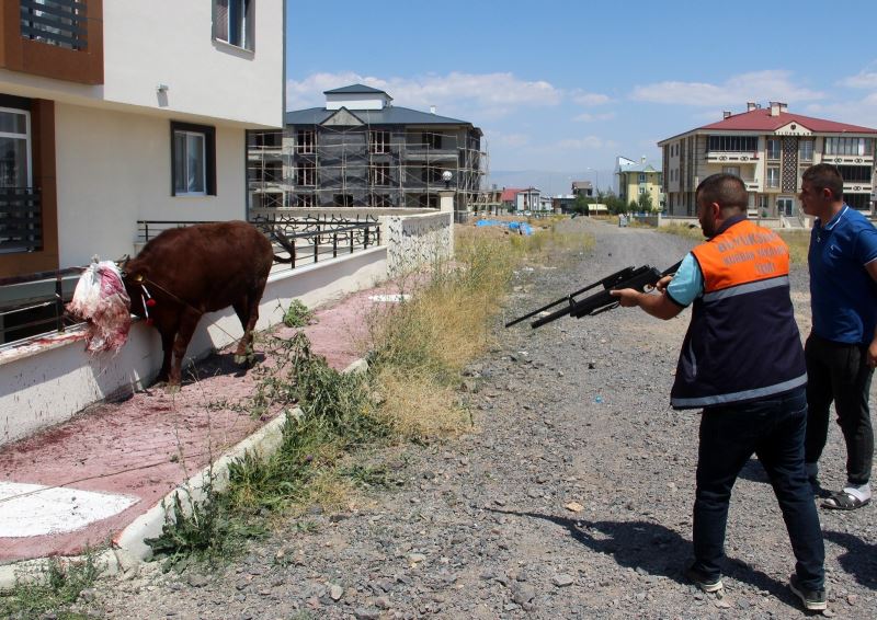 Erzurum’un merkeze bağlı farklı noktalar da kimi kurbanlık mezbahaneden kaçtı, kimisi de sahibinin elinden. Erzurum Yunusemre Mahallesi’nde sahibinin elinden kaçan kurbanlık tosun vatandaşlar tarafından yakalanamayınca durum Büyükşehir Belediyesi Kurban Yakalama Timine bildirildi. Olay yerine gelen ekip kurbanlık tosuna uyuşturucu iğne yaptı. Sahiplerinin yakalayacağı sırada kaçan kurbanlık ortalığı birbirine kattı. Kurbanlık tosunu 10 kişi zor yakalayarak kesime götürdü.