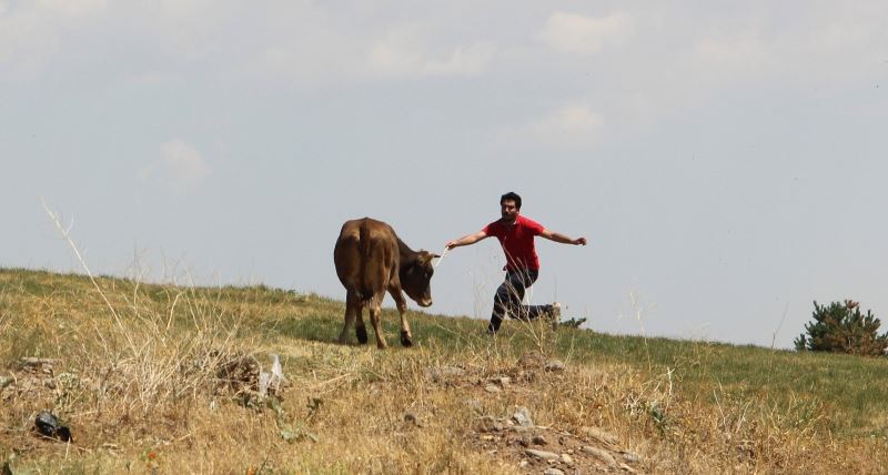 Erzurum’da kaçan kurbanlıklar ortalığı birbirine kattı. Sahibinin elinden kaçan kurbanlık tosun, kurban yakalama ekibinin uyuşturmasına rağmen 10 kişi tarafından zor yakalandı.