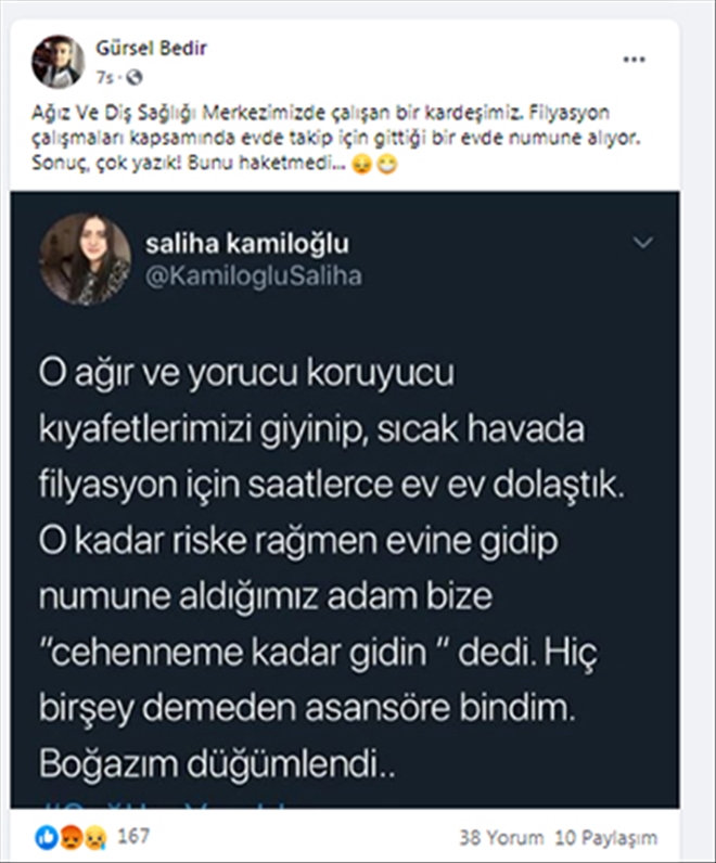 Doktor S.K., karşılaştığı durumla ilgili yaptığı paylaşımda, ´´ O ağır ve yorucu koruyucu kıyafetlerimizi giyinip, sıcak havada filyasyon için saatlerce ev dolaştık. O kadar riske rağmen evine gidip numune aldığımız adam bize ´cehenneme kadar gidin´ dedi. Hiçbirşey demeden asansöre bindim. Boğazım düğümlendi...´´dedi. İl Sağlık Müdürü Dr. Gürsel Bedir´in Doktorun bu paylaşımını paylaşıp altına yazdığı açıklama sonrası sağlık çalışanına karşı sergilenen çirkin tavır büyük tepki topladı.