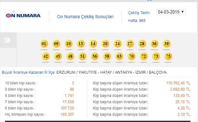 On Numara oyununun bu haftaki çekilişinde 10 bilen 3 kişi, 115 bin 762 lira 45´er kuruş ikramiye kazandı. Milli Piyango İdaresi Genel Müdürlüğü´nün resmi internet sitesinden paylaşılan bilgilere göre, bu haftaki çekilişte 9 bilen 86 kişi 2 bin 692 lira 60´şar kuruş, 8 bilen bin 741 kişi 133 lira 40´ar kuruş, 7 bilen 17 bin 556 kişi 25 lira 15´er kuruş, 6 bilen 107 bin 720 kişi 4 lira 30´ar kuruş, hiçbir numarayı doğru tahmin edemeyen 193 bin 357 kişi 3 lira 10´ar kuruş ikramiye kazandı. Büyük ikramiye ise üçe bölündü. Kuponların Erzurum- Yakutiye, İzmir-Balçova ve Hatay-Antakya ilçelerinden yatırdığı tespit edildi. Toplam 2 milyon 315 bin 236 lira 45 kuruş olan büyük ikramiyenin dağıtıldığı çekilişte, kamuya KDV olarak 922 bin 573 lira 7 kuruş, Şans Oyunları Vergisi olarak 514 bin 496 lira 99 kuruş aktarıldı.