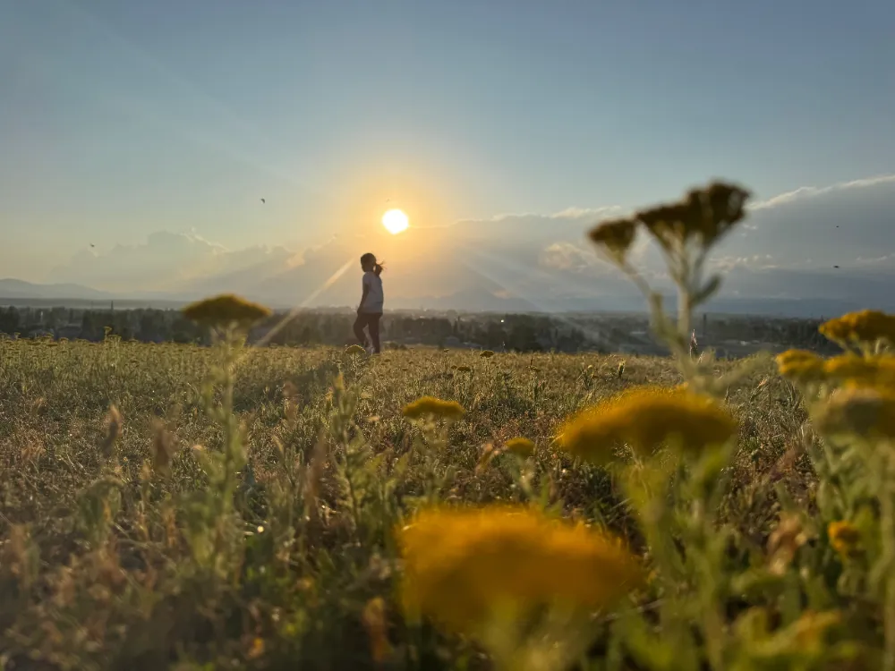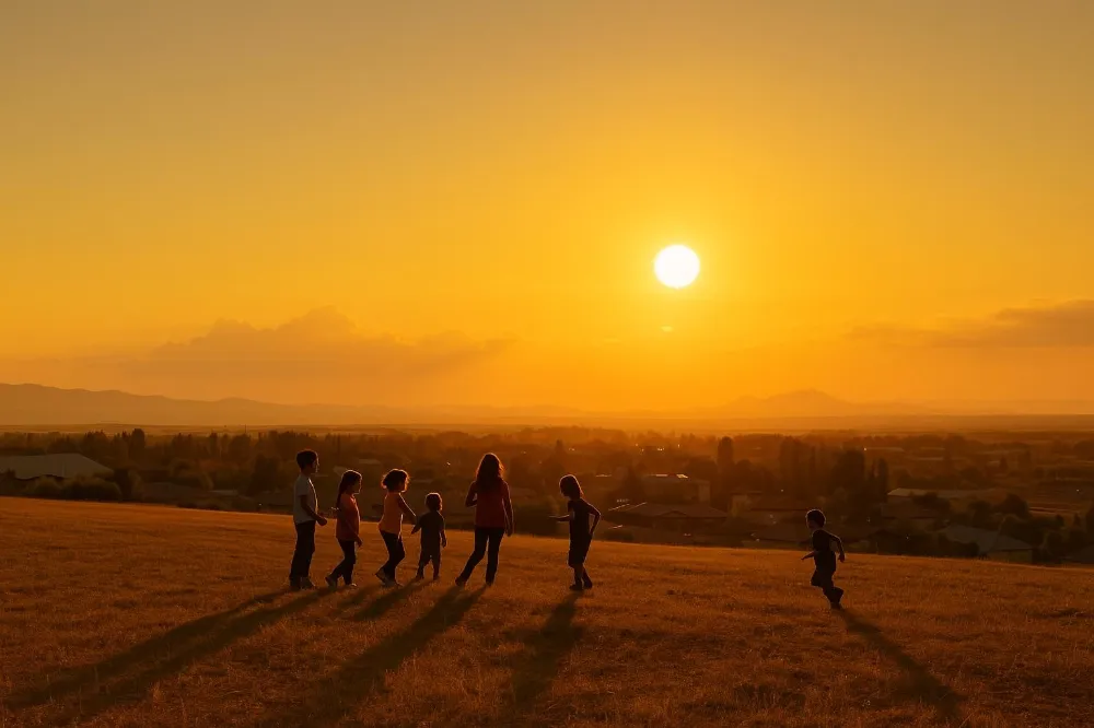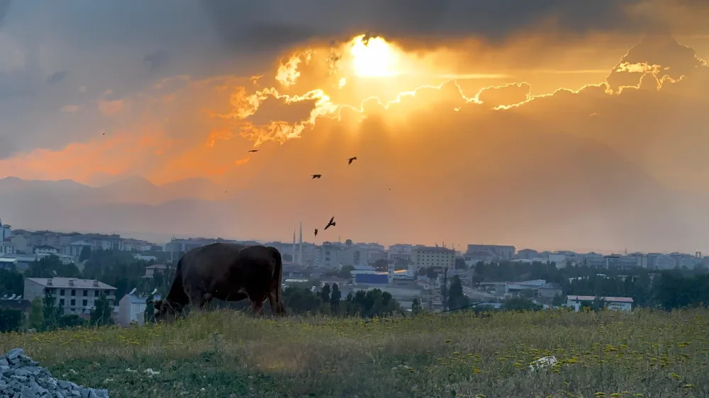 Günün son ışıklarıyla birlikte gökyüzü sarıdan kızıla dönerken, doğanın içinde oyun oynayan çocuklar, otlayan hayvanlar ve rengarenk açmış kır çiçekleri ile manzara adeta bir kartpostalı andırıyor.