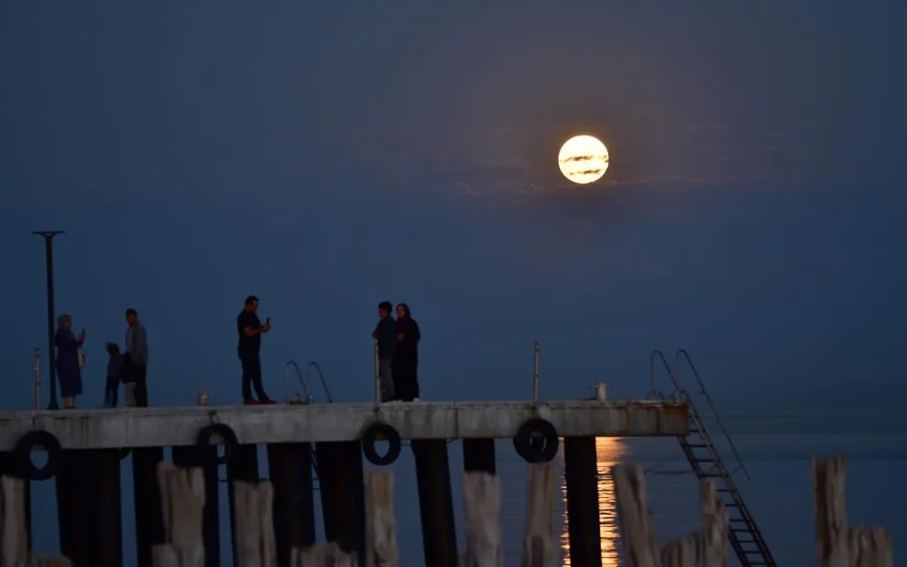 Bitlis’in Ahlat ilçesinde akşam saatlerinde iskele üzerinde beliren dolunay, Van Gölü üzerinde oluşturduğu yakamozla izleyenlere adeta görsel bir şölen yaşattı. Gökyüzünde tüm ihtişamıyla yükselen dolunay, göl yüzeyine yansıyarak eşsiz bir manzara oluşturdu.