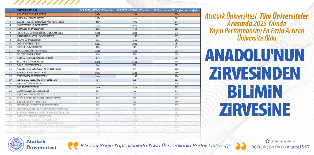 Atatürk Üniversitesi, uluslararası bilimsel yayın alanında gösterdiği istikrarlı yükselişle önemli bir başarıya imza attı. Üniversite 2025 yılında; SCI, SCIE ve AHCI indekslerinde yer alan yayın sayılarıyla tüm üniversiteler arasında bir önceki yıla göre yayın sayısını en fazla artıran üniversite olarak ilk sırada yer aldı.