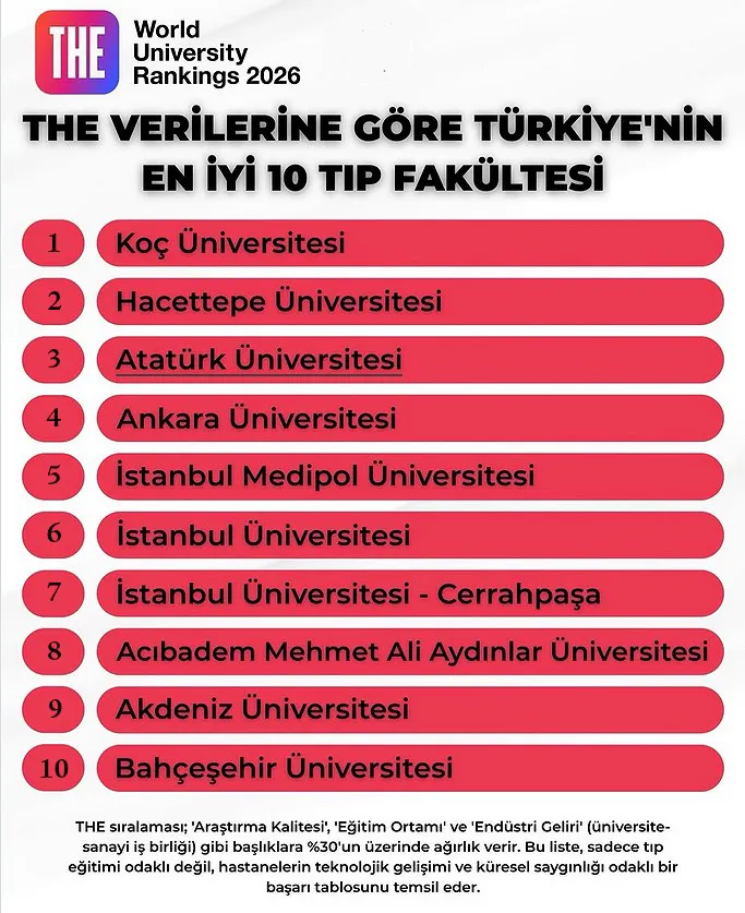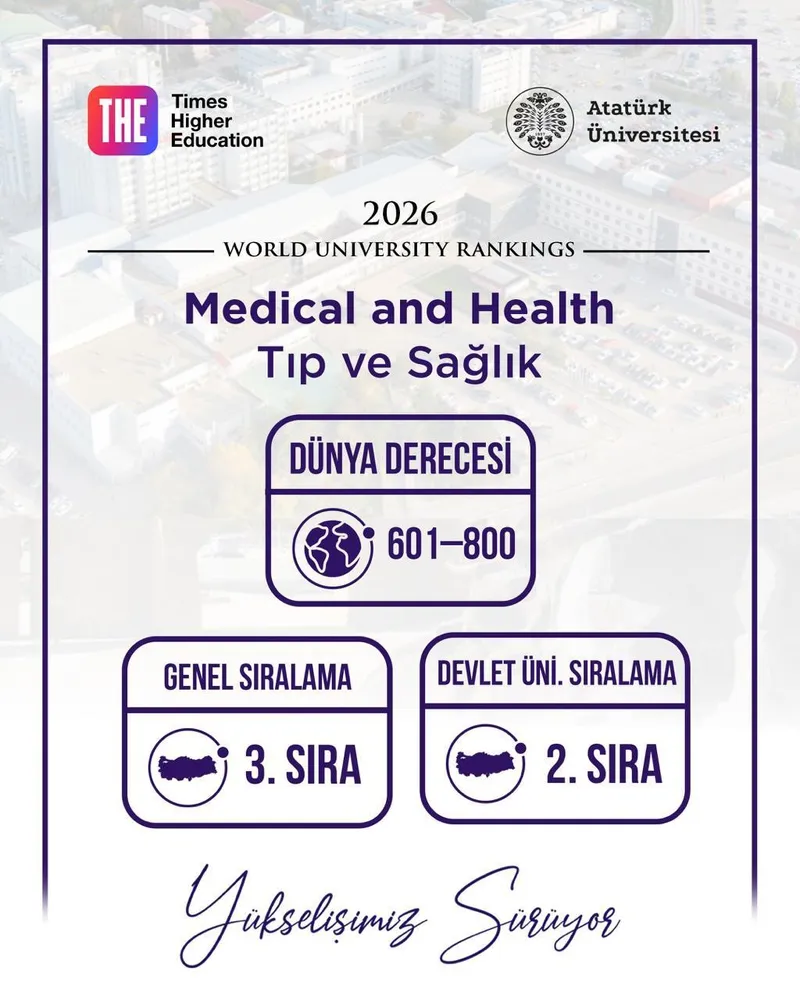 THE tarafından yayımlanan ve araştırma kalitesi, eğitim-öğretim ortamı, uluslararası görünürlük ve üniversite-sanayi iş birliği gibi birçok kriterin dikkate alındığı sıralamada elde edilen bu başarı, Atatürk Üniversitesinin sağlık alanındaki akademik birikimi ve güçlü altyapısının somut bir göstergesi oldu. Türkiye’nin en iyi tıp fakülteleri listesinde de üst sıralarda yer alan üniversite, özellikle sağlık bilimleri alanındaki nitelikli çalışmalarıyla dikkat çekmeye devam ediyor.
