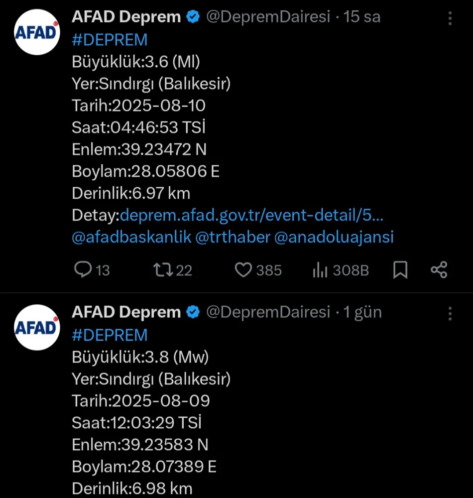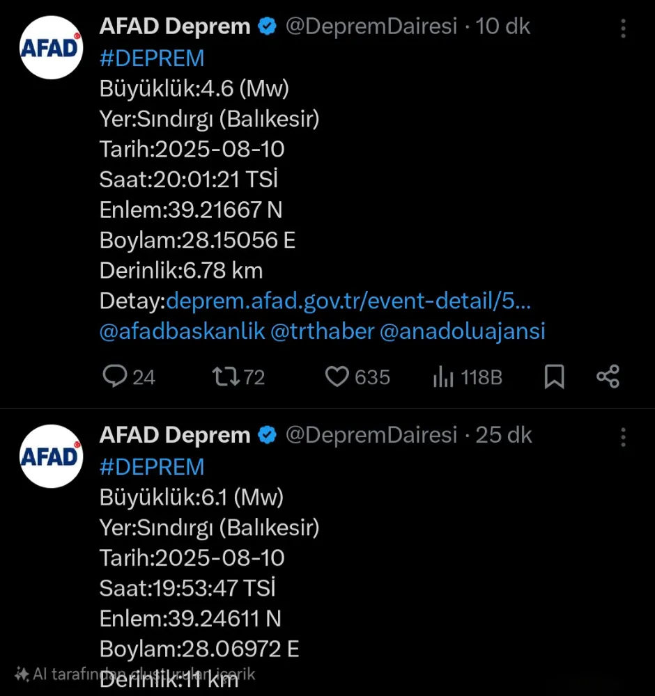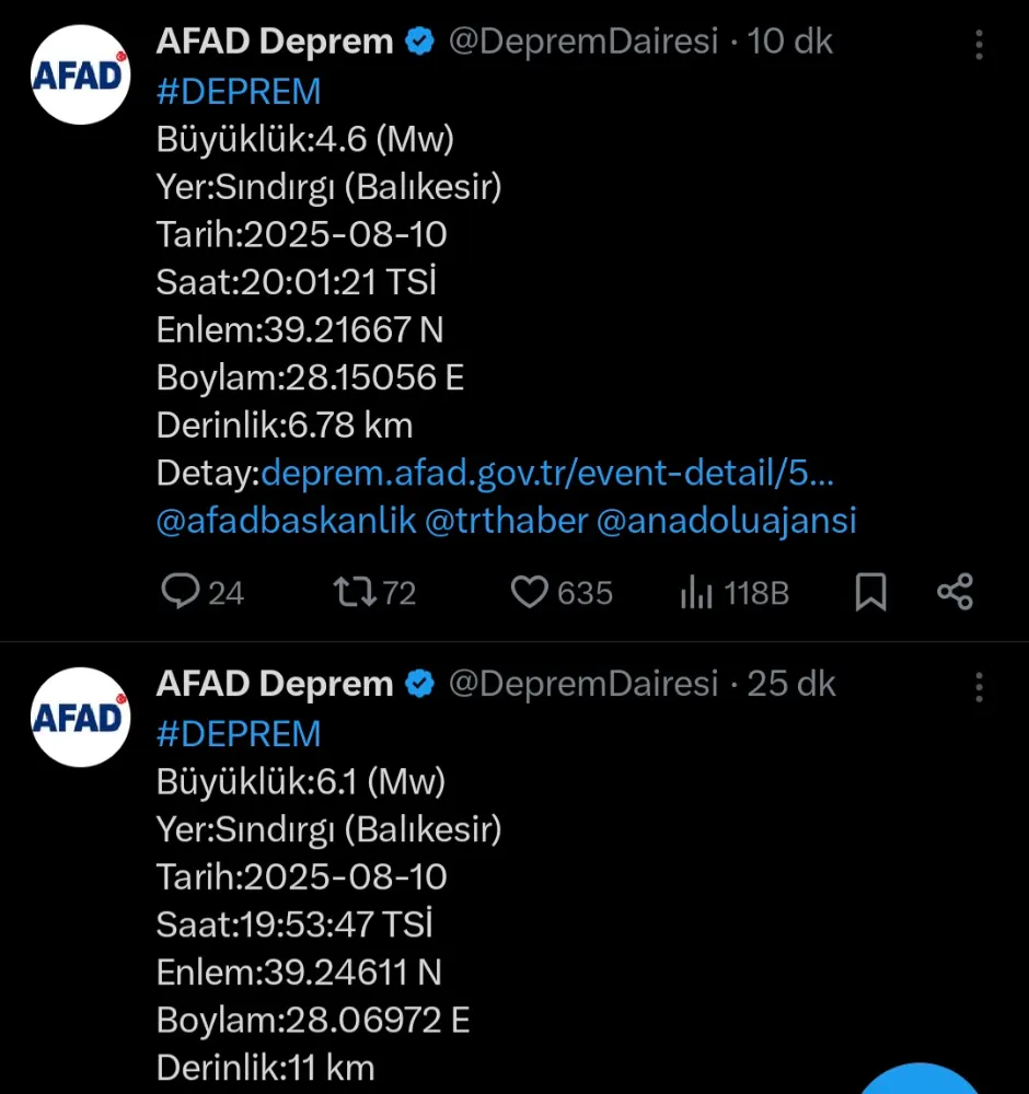 Balıkesir’in Sındırgı ilçesinde bugün saat 19.53’te 6.1 büyüklüğünde deprem kaydedildi. Yerin 11 kilometre derinliğinde gerçekleşen sarsıntı, başta Balıkesir olmak üzere çevre illerden de hissedildi. Aradan yalnızca 8 dakika sonra, saat 20.01’de aynı bölgede 4.6 büyüklüğünde bir artçı deprem meydana geldi.
