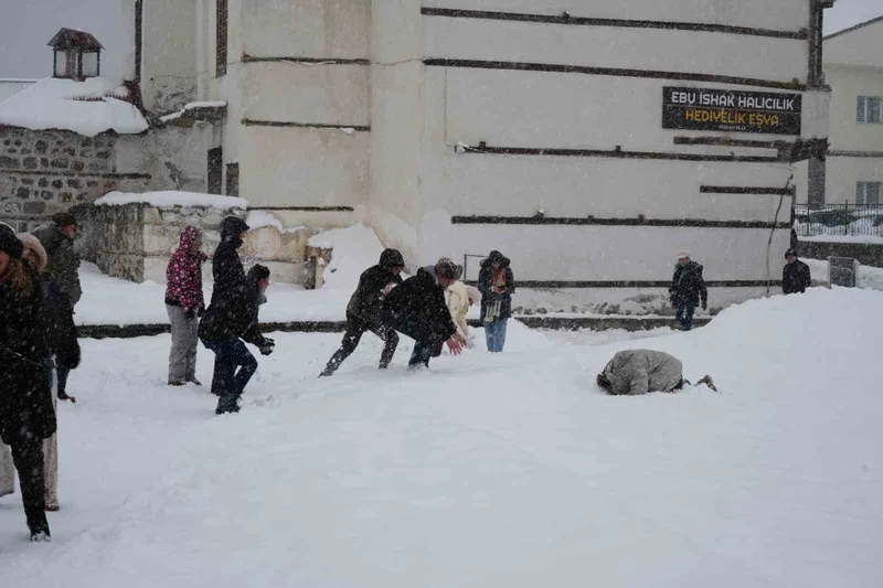 Kristal karın keyfini kar içinde yuvarlanarak yaşayan Belçikalı turistler, Üçkümbetler’de Türklerden oluşan baika bir turist grubuyla kar topu savaşı yaptı. Kar topu savaşının sonunda dostluk mesajları verildi.