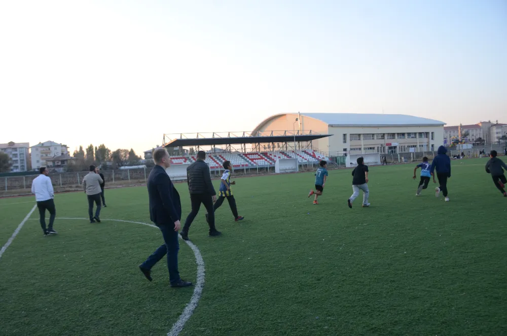 Bulanık Kaymakamı Ömer Övünç Koşansu, ilçe stadında incelemelerde bulunurken futbol sahasındaki çocukları ziyaret etti. Kaymakam Koşansu, sahada çocuklarla bir süre futbol oynadı. Göreve geldiği günden beri Bulanık ilçesinde vatandaşların sevgisini kazanmaya devam eden Kaymakam Koşansu, koltuğa oturmak yerine sürekli vatandaşlarla bir araya geliyor. Halkının gönlüne taht kuran Kaymakam Koşansu, ilçe stadyumunda inceleme ve denetimlerde bulunurken futbol sahasında top oynayan çocuklarla bir araya geldi. Çocuklarla bir süre top oynayan Kaymakam Koşansu, birbirinden yetenekli hareketlerini futbolda sergileyen çocuklara teşekkür etti. Çocuklar maç sonrası Kaymakam Koşansu'yla hatıra fotoğrafı çektirdi.