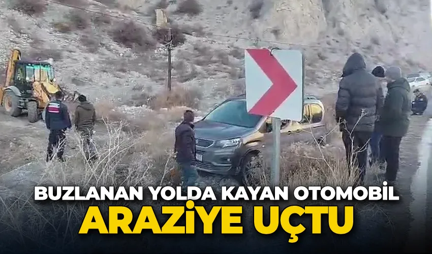 Buzlanan yolda kayan otomobil araziye uçtu