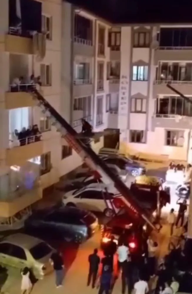 Elazığ’da düğün sonrası damat, arkadaşlarının veda dayağından kaçmak için eve koşarak girdi. Yük asansörüyle balkona çıkıp damadı orada yakalayan arkadaşlarının o anları güldürdü.