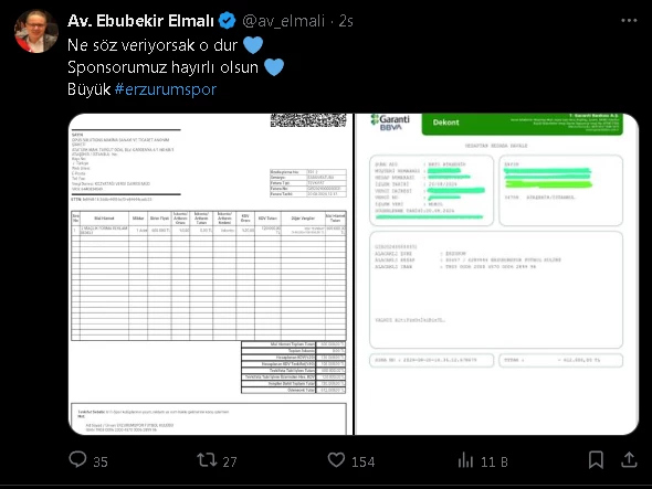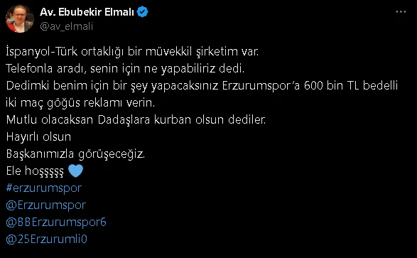 Erzurum’da son günlerde yaptığı çalışmalarla adından söz ettirmeyi başaran Yeniden Refah Partisi Hukuk İşleri Komisyonu üyesi olan Erzurumlu Avukat Ebubekir Elmalı, Erzurumspor’a 600 bin liralık forma sponsoru buldu. Elmalı, geçtiğimiz günlerde sosyal medya hesabı üzerinden yaptığı açıklamada “İspanyol-Türk ortaklığı bir müvekkil şirketim var. Telefonla aradı, ‘senin için ne yapabiliriz’ dedi. Dedim ki benim için bir şey yapacaksınız Erzurumspor’a 600 bin TL bedelli iki maç göğüs reklamı verin. Mutlu olacaksan Dadaşlara kurban olsun dediler. Hayırlı olsun” ifadelerini kullanmıştı.