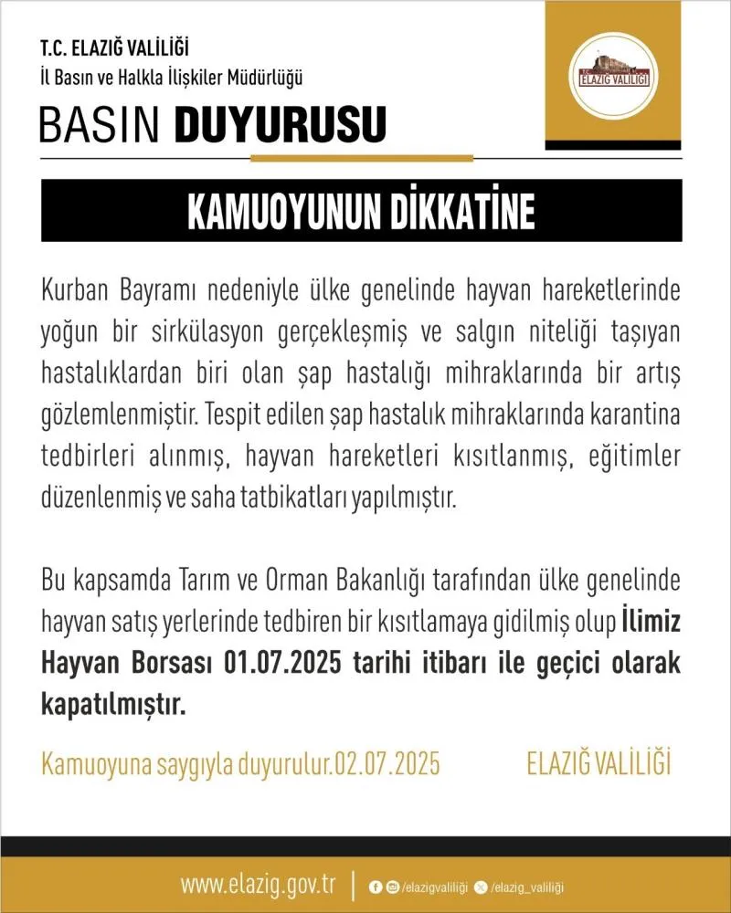 Elazığ Valiliğinden yapılan açıklamada, Kurban Bayramı nedeni ile ülke genelinde hayvan hareketlerinde yoğun bir sirkülasyon gerçekleştiği ve salgın niteliği taşıyan hastalıklardan biri olan şap hastalığı mihraklarında bir artış gözlemlendiği belirtildi. Açıklamada, ''Tespit edilen şap hastalık mihraklarında karantina tedbirleri alınmış, hayvan hareketleri kısıtlanmış, eğitimler düzenlenmiş ve saha tatbikatları yapılmıştır. Bu kapsamda Tarım ve Orman Bakanlığı tarafından ülke genelinde hayvan satış yerlerinde tedbiren kısıtlamaya gidilmiş olup ilimiz Hayvan Borsası 1 Temmuz 2025 tarihi itibari ile geçici olarak kapatılmıştır’’ denildi.