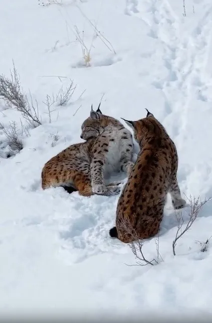Nesli tükenme tehlikesi altında bulunan iki vaşak, bir vatandaşın cep telefonu kamerasına takıldı. Ender rastlanan vaşakların doğal yaşam alanında kar üzerinde kendilerini temizledikleri anlar görüldü.