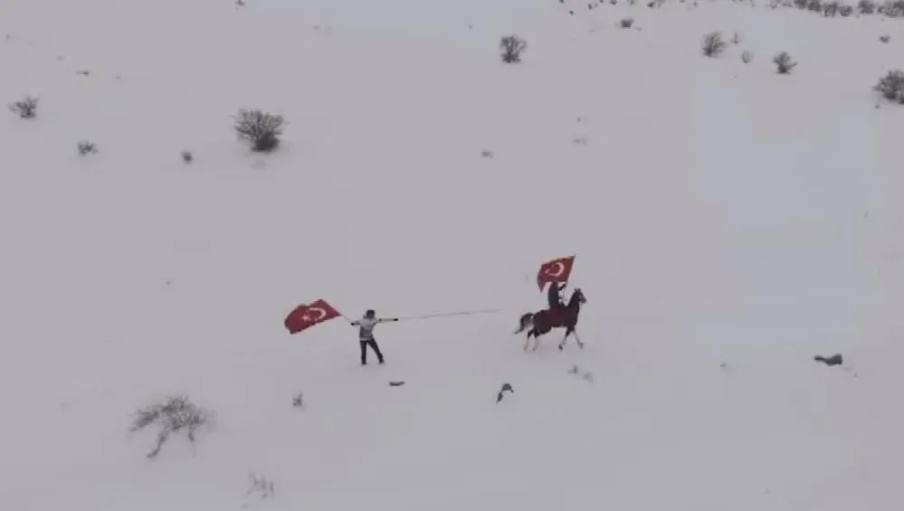 Kar kalınlığının yaklaşık 30 santimetreyi bulduğu arazide bir araya gelen sporcular, önce atlarla beyaz örtüyle kaplanan ovada gezinti yaptı. Daha sonra yanlarında getirdikleri snowboardlarla atların arkasına bağlanan ipleri tutan gençler, ellerinde Türk bayraklarıyla snowboard yaptı.