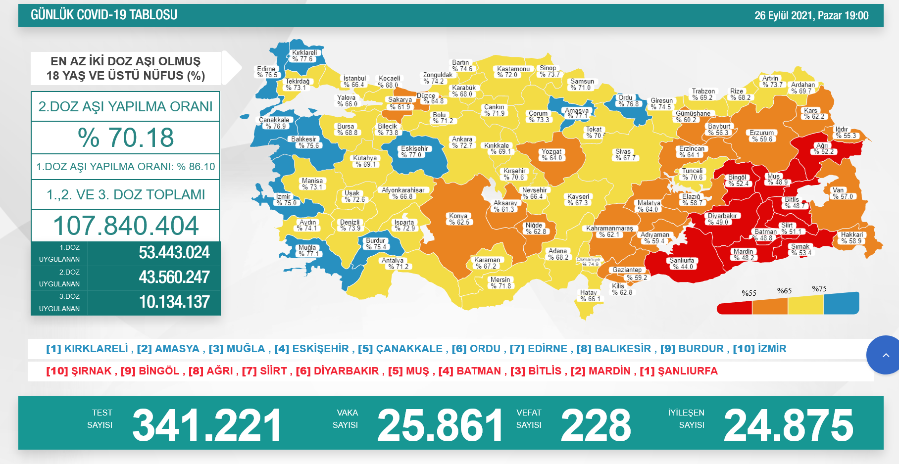 27 Eylül Pazar günü yayımlanan Kırmızı, turuncu, sarı ve mavi kategorilerle ifade edilen toplam nüfus içinde aşı oranı son haritasında Doğu Anadolu Bölgesinde Elazığ, Muş ve Bingöl illeri sarı, diğer iller ise mavi kategoride yer aldı. Aşı olan kişi sayısının toplam nüfusa oranı yüksekliği bazında Ardahan ilk sıradaki yerini korudu