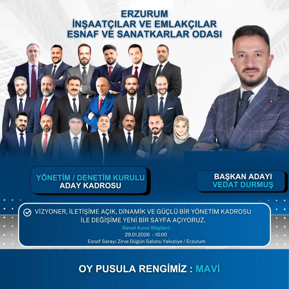 Erzurum İnşaatçılar ve Emlakçılar Esnaf ve Sanatkârlar Odası’nda 2026 yılı oda seçimleri öncesi seçim atmosferi giderek hareketleniyor. Oda başkanlığına Vedat Durmuş adaylığını açıklarken, yeni ve vizyoner kadrosuyla birlikte seçim çalışmalarına resmen başladı.