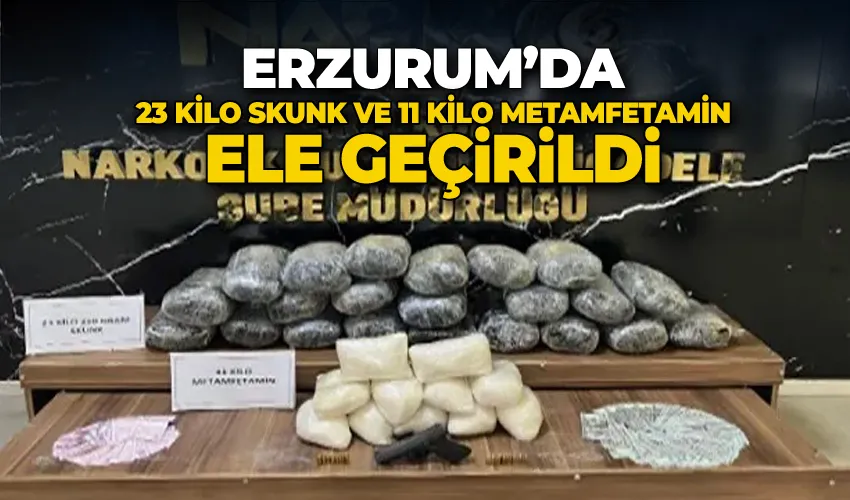 Erzurum’da polisin düzenlediği operasyonda 23 kilogram skunk ve 11 kilogram metamfetamin maddesi ele geçirildi.