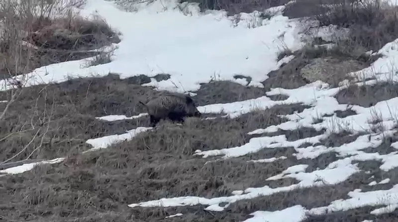 Edinilen bilgilere göre, sürüsünden ayrılan yavru domuz, yeniden ailesine kavuşabilmek için sürüsünün ayak izlerini takip etmeye çalıştı. Zaman zaman durarak iz süren yavrunun, ardından yeniden ilerlediği görüldü.