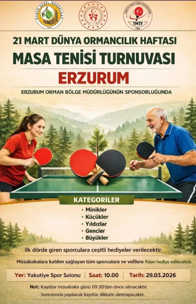 Erzurum’da Dünya Ormancılık Haftası kapsamında düzenlenecek masa tenisi turnuvası, sporcuları bir araya getirirken katılımcılara fidan dağıtımıyla çevre bilincine de katkı sağlayacak.
