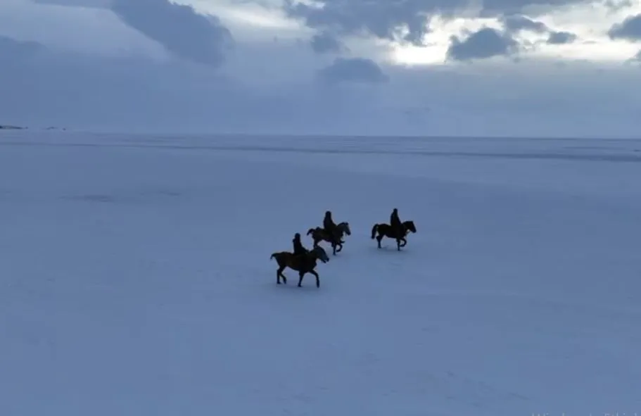 Çıldır Gölü'nde kışın büyüleyici atmosferi bir kez daha dikkat çekti. Yüzeyi tamamen donan gölün üzerinde atlarına binen gençler, dörtnala koşarak adeta doğayla iç içe nefes kesen anlara imza attı.