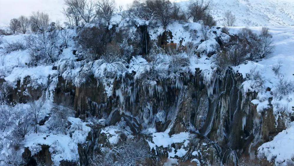 Erzincan'da doğal güzelliğiyle öne çıkan Girlevik Şelalesi, hava sıcaklığının sıfırın altında 10 dereceye kadar düşmesiyle buz tuttu. Ortaya çıkan görüntü ise görenleri kendine hayran bıraktı.