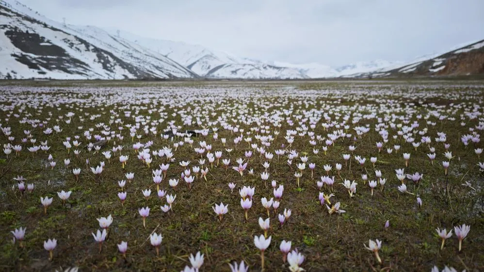 Bitlis'in Tatvan ilçesindeki Güzeldere Vadisi, açan çiğdem çiçekleriyle beyaz ve pembeye bürünerek güzel görüntüler oluşturuyor.