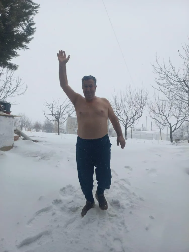 Olay, merkeze bağlı Beyyurdu Mahallesi'nde yaşandı. Edinilen bilgiye göre, mahalle sakinlerinden İlhami Çelik, sabah saatlerinde başlayan ve kent genelinde halen etkisini sürdüren kar yağışını üstsüz sokağa çıkarak kutladı. Vücudunun bazı kısımlarını yağan karla ıslatan vatandaş, o anları da cep telefonu kamerası ile kayda aldırdı.