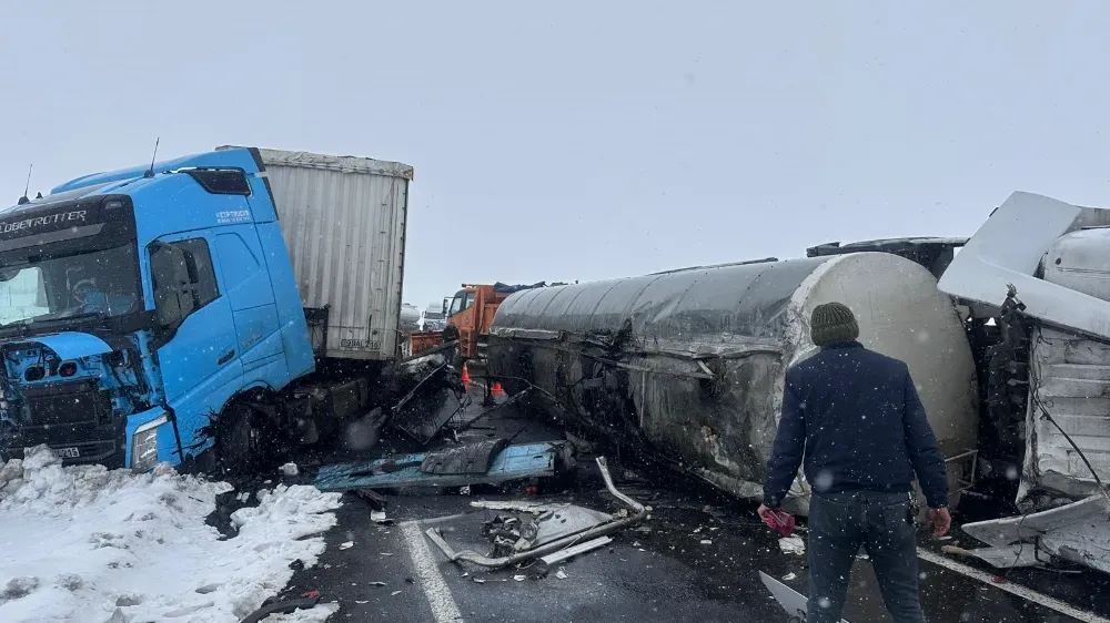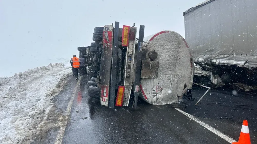 Kaza, Kars - Çıldır kara yolunda meydana geldi. Kars’tan Çıldır istikametine seyir halindeki zift yüklü tanker havanın kar yağışlı ve sisli olmasından dolayı yoldan çıkarak yan yattı. Karşı yönden gelen kereste yüklü tırın tankere çarpmasıyla meydana gelen zincirleme kazada sürücüler yaralandı.