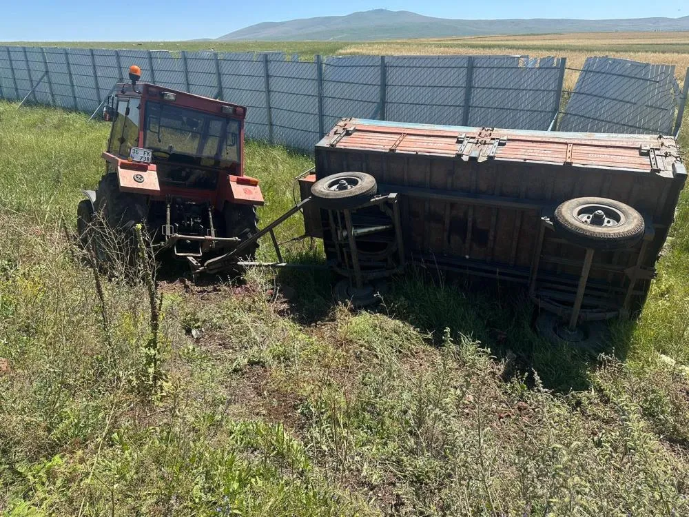 Kars’ta seyir halindeki traktörün römorku devrildi. Kaza 1 kadın yaralandı.