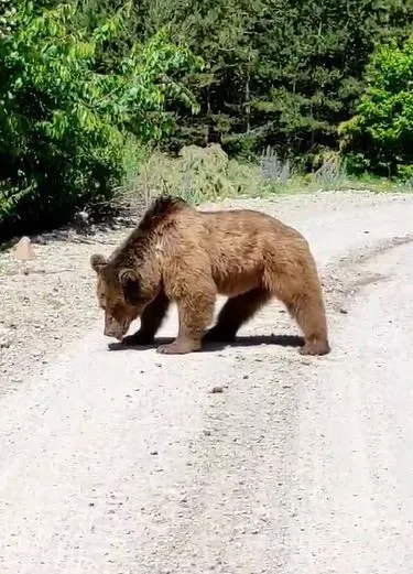 Sıcaktan bunaldığı gözlenen boz ayı bir süre sonra yoldan çıkarak ormanlık alan girdi ve gözden kayboldu.
