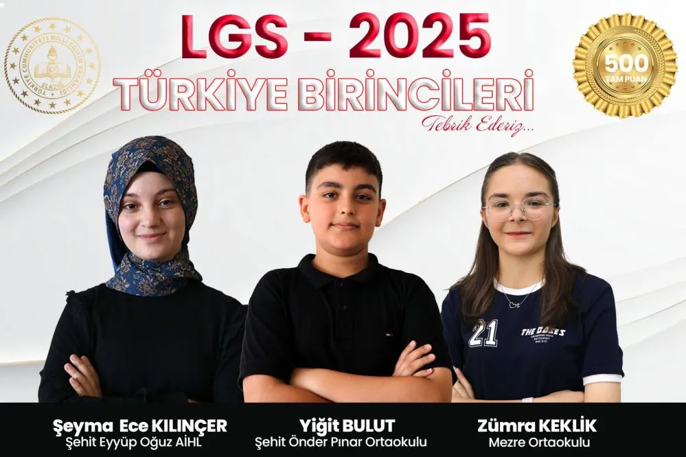 Elazığ’da 3 öğrenci LGS’de 500 tam puan alarak Türkiye birincisi oldu.