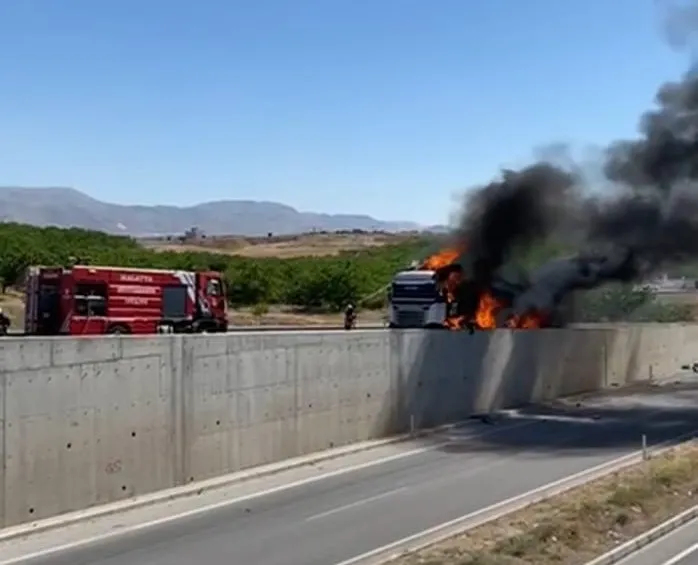 Olay, saat 15.30 sıralarında Malatya Havalimanı yolu üzerindeki Bindal Kavşağı mevkiinde meydana geldi. Edinilen bilgilere göre, seyir halindeki bir tırın lastiği patladı. Kontrolden çıkan araç, yol kenarındaki bariyerlere çarptı. Çarpmanın etkisiyle araç bir anda alev alırken, olay yerine itfaiye ekipleri sevk edildi. Kısa sürede büyüyen yangın, aracın tamamını sardı. Tır tamamen yanarak kullanılamaz hale gelirken, sürücü kazayı yara almadan atlattı. Ekiplerin müdahalesi sonucu yangın kontrol altına alınarak söndürüldü.
