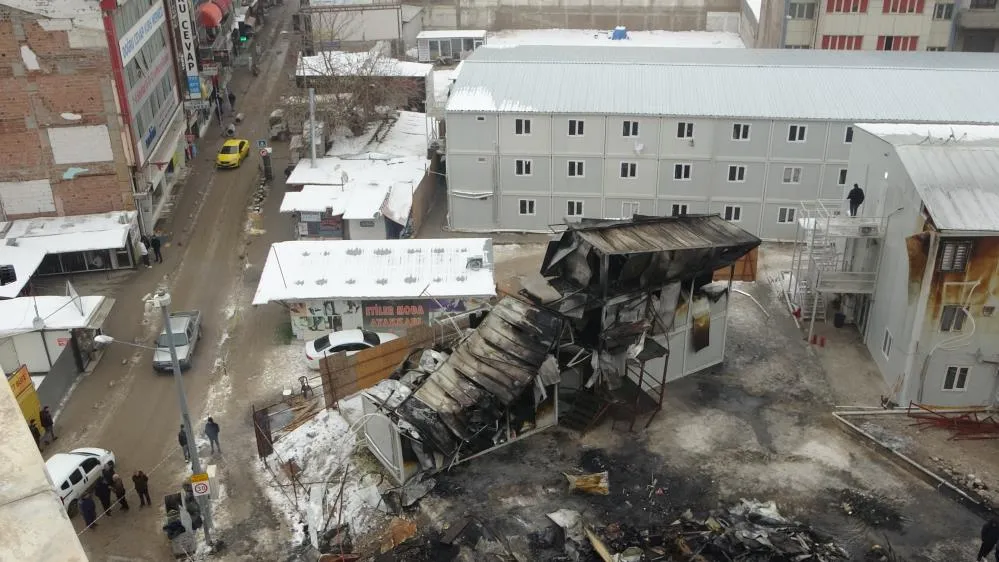 Malatya'da dün akşam saatlerinde Battalgazi ilçesi İzzetiye Mahallesi Nasuhi Caddesi'nde bulunan bir şantiyede işçilerin kaldığı prefabrik yatakhanede çıkan yangın kısa sürede büyüdü. Yangının hızla yayılmasıyla beraber çok sayıda prefabrik yapı küle dönerken geriye demir yığınları kaldı. Yangının yol açtığı zarar ise gündüz saatlerinde görüntülendi.