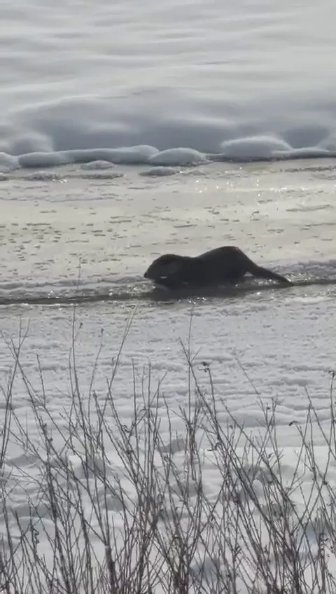 Ağrı'nın Taşlıçay ilçesinde iki su samuru Murat Nehri'nde yiyecek ararken görüntülendi.