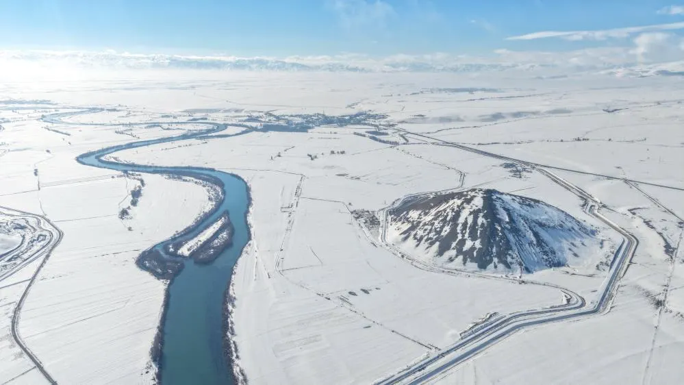 'Muş Piramidi' olarak bilinen Mercimek Kale Höyüğü, etkili olan kar yağışının ardından beyaz örtüyle kaplanarak eşsiz görüntüler sundu.