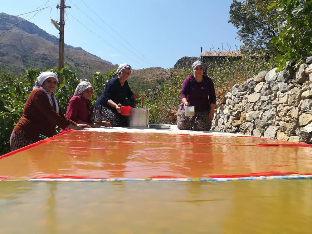 Dutun önemli geçim kaynağı olduğu Erzincan’ın Kemaliye ilçesinde kadınlar, zorlu pestil ve pekmez yapımını imece usulü gerçekleştiriyor.