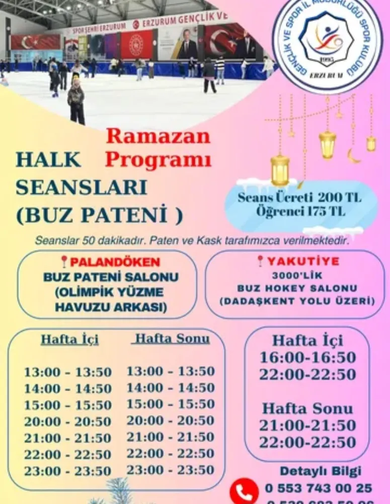 Erzurum Gençlik ve Spor İl Müdürlüğü, Ramazan ayına özel olarak vatandaşların keyifli ve sağlıklı vakit geçirebilmesi amacıyla Halk Buz Pateni Seansları düzenledi.