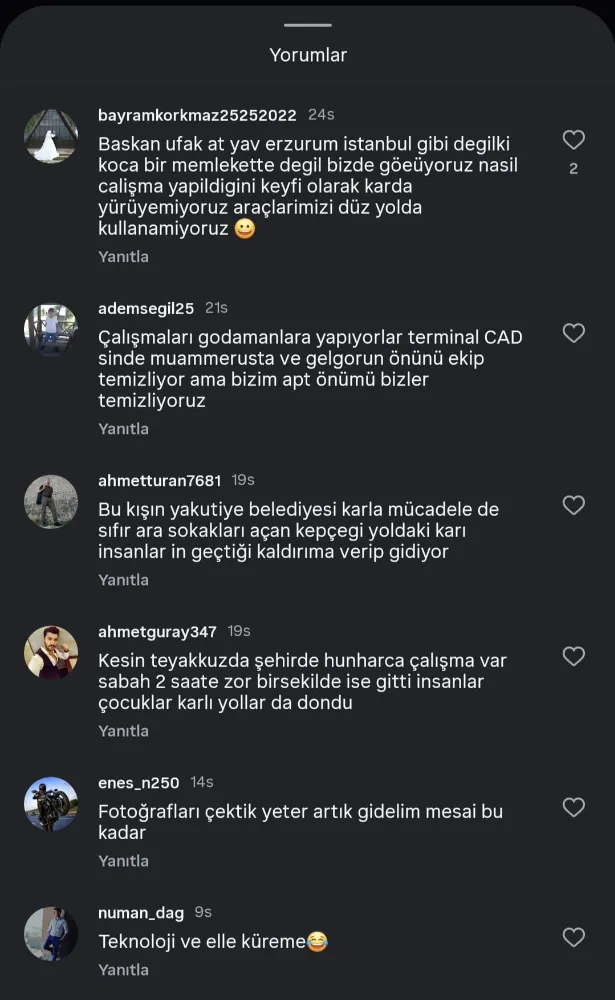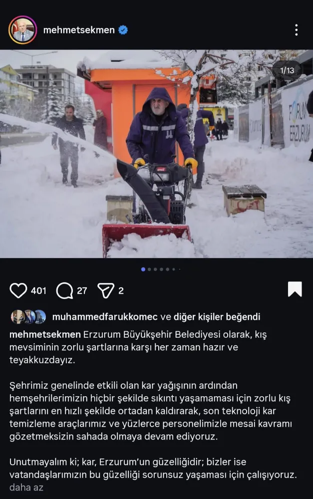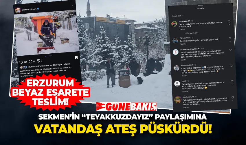 Erzurum Büyükşehir Belediyesi Başkanı Mehmet Sekmen, Instagram hesabı üzerinden yaptığı paylaşımda, son teknoloji araçlar ve yüzlerce personelle sahada olduklarını belirterek, "Kar Erzurum’un güzelliğidir, biz bu güzelliği sorunsuz yaşamanız için çalışıyoruz" ifadelerini kullandı. Ancak bu paylaşımın altına bir çok mağdur vatandaş tepki gösterdi.