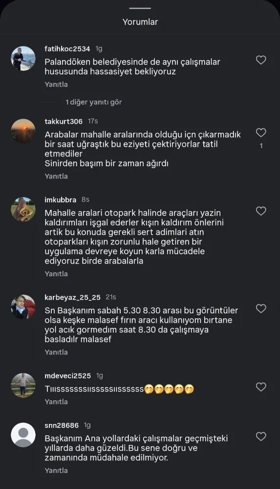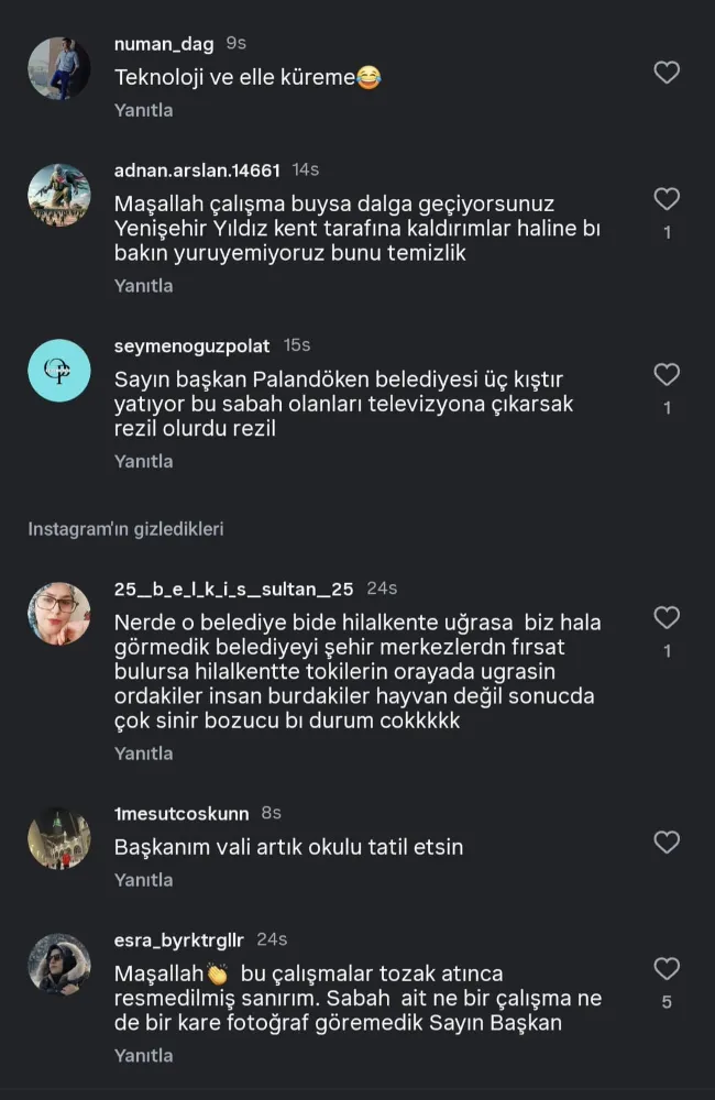 Enes Arslan adlı kullanıcı ise “Belediyenin saha fotoğraflarını eleştirerek, “Fotoğrafları çektik, yeter artık gidelim, mesai bu kadar!” sözleriyle durumu tiye aldı.