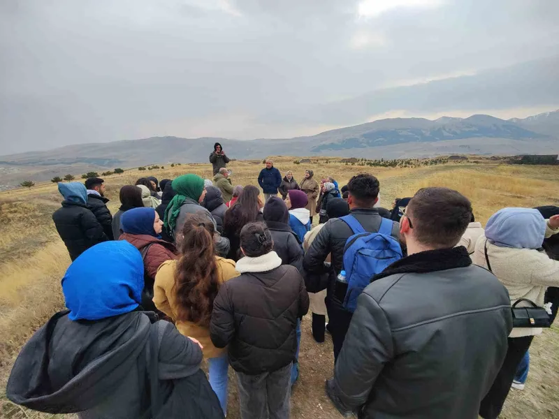 Prof. Dr. İbrahim Kopar, öğrencilere Erzurum Ovası ve Palandöken Dağları’nın oluşum süreci hakkında bilgiler verdi. Programın bir diğer durağı ise yerel bir su üretim tesisi oldu. Öğrenciler, tesisi yerinde inceleyerek, üretim süreçlerini gözlemledi. Gezinin son bölümünde ise Erzurum’un yeterince tanınmayan arkeolojik alanlarından Hamamderesi Kaya Mezarları ziyaret edildi. Prof. Dr. Kopar, öğrencilere antik dönemlerde insan eliyle yapılmış bu alanın oluşum süreci ve kaya yapısını anlattı.