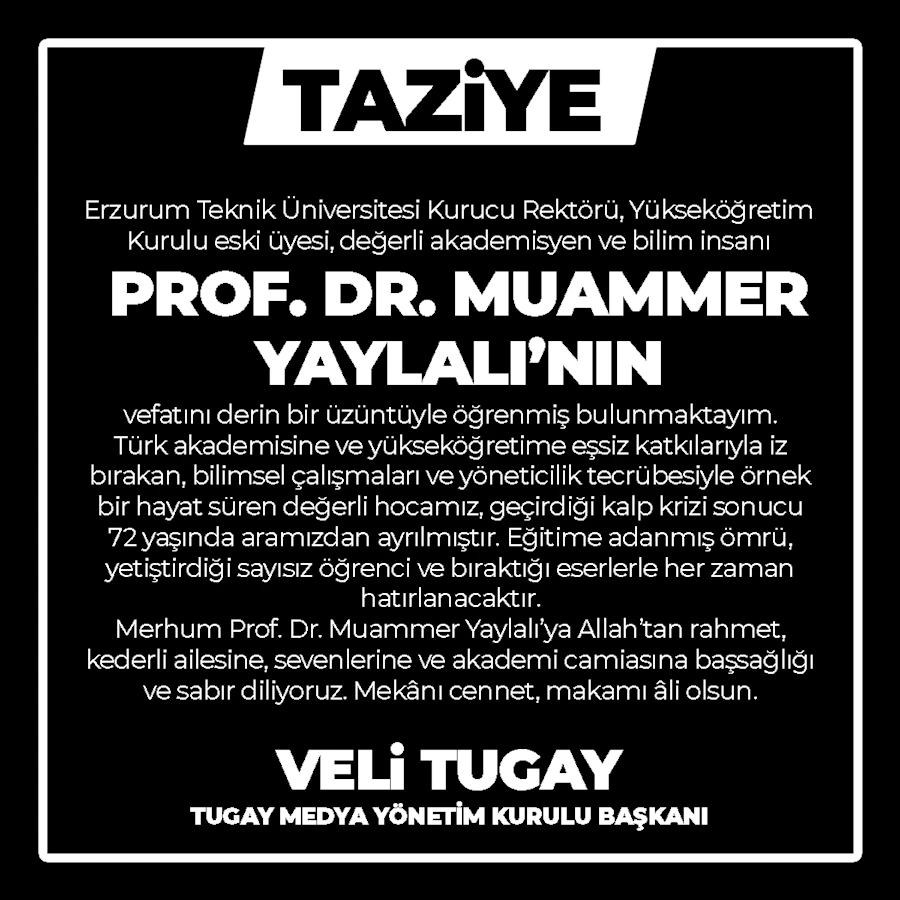 Erzurum Teknik Üniversitesi Kurucu Rektörü, Yükseköğretim Kurulu eski üyesi, değerli akademisyen ve bilim insanı Prof. Dr. Muammer Yaylalı’nın vefatını derin bir üzüntüyle öğrenmiş bulunmaktayız.