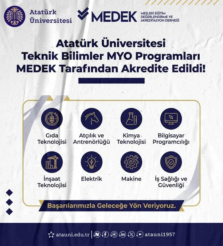 Atatürk Üniversitesi kalite odaklı eğitim anlayışını bir kez daha tescilleyerek önemli bir başarıya imza attı. Teknik Bilimler Meslek Yüksekokulu bünyesinde yer alan Gıda Teknolojisi, Atçılık ve Antrenörlüğü, Kimya Teknolojisi, Bilgisayar Programcılığı, İnşaat Teknolojisi, Elektrik, Makine ile İş Sağlığı ve Güvenliği Programları, Mesleki Eğitim Değerlendirme ve Akreditasyon Derneği (MEDEK) tarafından akredite edildi.
