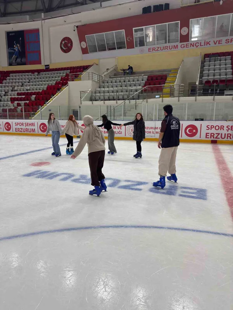 Daha sonra gençler Erzurum Buz Pateni Salonu’nu ziyaret ederek buz pateni deneyimi yaşadı. İlk kez buz pateni yapan öğrenciler için heyecan dolu anlar yaşanırken, ortaya renkli görüntüler çıktı.