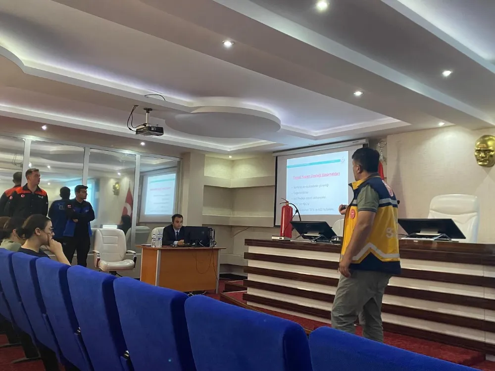 Valilik personeline yönelik olarak gerçekleştirilen yangın eğitimi kapsamında; Yangın anında yapılması gerekenler, tahliye yöntemleri, yangın söndürme ekipmanlarının kullanımı ve temel yangın güvenliği konuları verildi. AFAD müdürlüğü bünyesinde Arama Kurtarma Teknisyeni olarak görev yapan Ramazan Uçar ve Samet Yağcı tarafından,