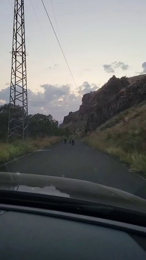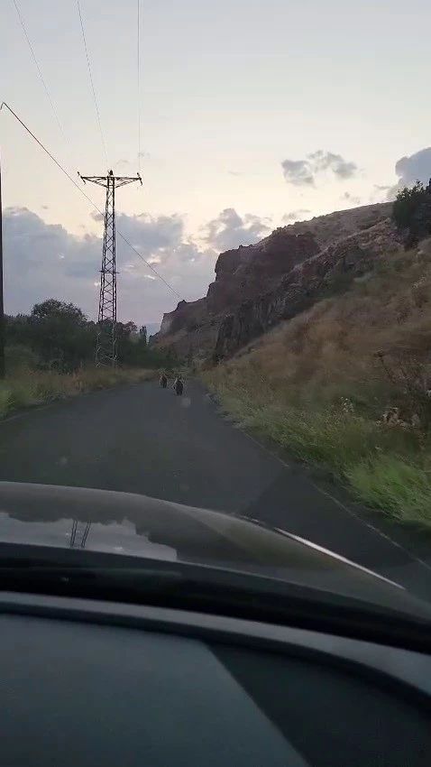 Şenkaya ilçesine bağlı Göreşken köyünde otomobille seyreder sürücü bir anda karşısında ayı ailesini gördü. 3 yavru ayı bir süre otomobilin önünde seyrettikten sonra gözden kayboldu.