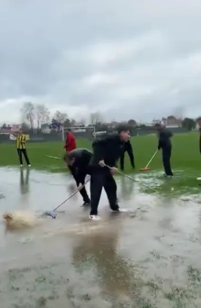 Yoğun yağış nedeniyle oluşan su birikintilerini taraftar ve görevliler temizledi